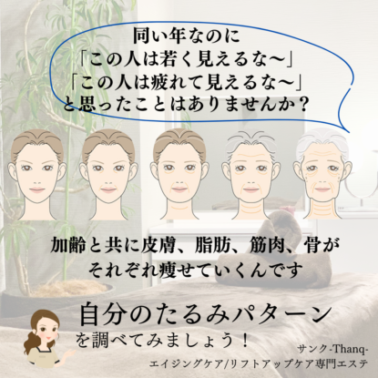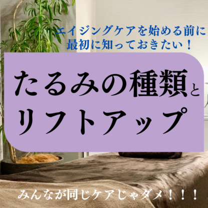 今まで学んできた女性のエイジングケア・リフトアップの知識に加え、「たるみ」で悩むお客様を見て話してケアをして、現場で感じた経験をもとに、「リアルなたるみ情報」をここにまとめました!
