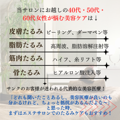 多角的かつ継続的なケアが求められるたるみ改善ケアに、サンクは通いやすい美容メンテナンスエステサロンとして40代・50代・60代と幅広い年齢層のお客様に愛されています。