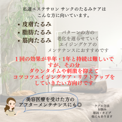 サンクにご来店頂くお客様は、『最初は4~6回はたるみ改善のケア』としてプランニングしていくことが多いです。そして、最初に集中的に通って頂くと、最初と比べるとたるみが改善していく方がほとんどです!(もちろん効果の出方・体感・実感は個人差があります。)